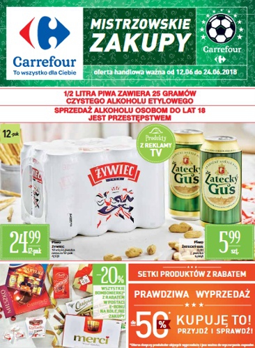 {loadposition linkCarrefour} 'Mistrzowskie zakupy' - nowa gazetka promocyjna sieci sklepów Carrefour. Polecane promocje z gazetki Carrefour: Piwo Żywiec 12x500 ml - 24,99 zł. Piwo Zatecky Gus 900 ml - 5,99 zł. Paluchy piwne Stema 100 g - 2,29 zł.…