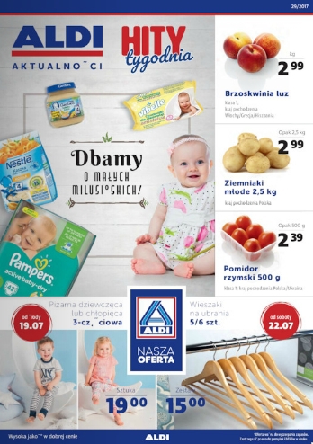 {loadposition linkAldi} Nowa gazetka promocyjna Aldi - "Dbamy o małych milusińskich!". Polecane promocje z gazetki Aldi: Piżama dziewczęca ub chłopięca - 19 zł. Wieszaki na ubrania zestaw - 15 zł. Brzoskwinie 1 kg - 2,99 zł. …