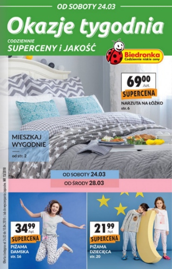 {loadposition linkBiedronka} 'Okazje tygodnia - codziennie superceny i jakość' - nowa gazetka promocyjna sieci sklepów Biedronka. Polecane promocje z gazetki sieci Biedronka: Narzuta na łóżko - 69 zł. Piżama damska - 34,99 zł. Piżama dziecięca -…