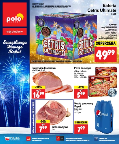 {loadposition linkPoloMarket} Nowa gazetka promocyjna Polo Market - "Szczęśliwego Nowego Roku!". Polecane promocje z gazetki Polo Market: Bateria Cetris Ultimate 45 strzałów - 49,99 zł. Polędwica łososiowa Madej Wróbel 1 kg - 16,99 zł. Pizza Guseppe Dr.…