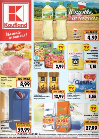 {loadposition linkKaufland} Nowa gazetka promocyjna marketu Kaufland - "Wszystko, co kochasz". Polecane promocje z gazetki Kaufland: Olej Kujawski 1 L - 4,59 zł. Pizza Rigga Dr. Oetker - 2,99 zł. Mąka pszenna tortowa 1 kg - 1,15 zł. …