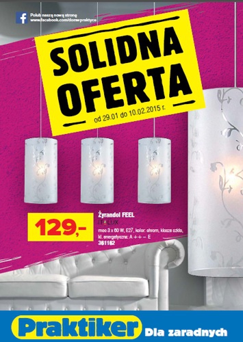 Nowa gazetka promocyjna Praktiker - "Solidna oferta". Polecane promocje z gazetki Praktiker: Żyrandol FEEL - 129 zł. Żyrandol OMNIA VENGE - 109 zł. Plafon PICCADILLY - 79,99 zł. Oferta ważna od 29.01 do 10.02.
