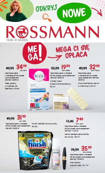 'Odkryj nowe' - nowa gazetka promocyjna drogerii Rossmann. Polecane promocje z gazetki Rossmann: Plastry z woskiem do depilacji Veet 40 sztuk - 34,99 zł. Krem przeciwzmarszczkowy L'Oreal 50 ml - 19,99 zł. Serum z witaminą C Miya Cosmetics 30…