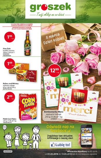 {loadposition linkGroszek} Nowa gazetka promocyjna sieci sklepów Groszek. Polecane promocje z gazetki Groszek: Bombonierka Merci 250 g - 12,99 zł. Piwo Żubr 500 ml - 1,95 zł. Płatki Nestle Corn Flakes 250 g - 2,99 zł.…
