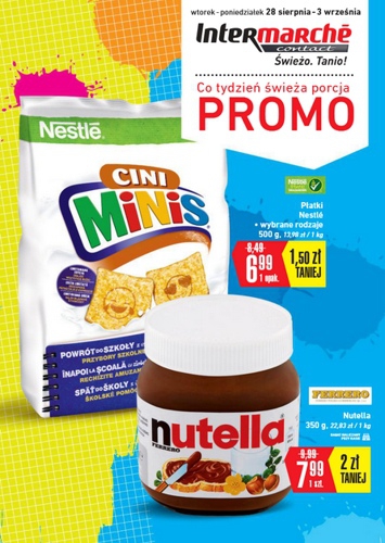 {loadposition linkIntermarche} Nowa gazetka promocyjna sieci sklepów Intermarche. Polecane promocje z gazetki Intermarche: Płatki Nestle 500 g - 6,99 zł. Nutella 350 g - 7,99 zł. Serek kanpakowy Hochland 4x30 g - 2,49 zł. Oferta ważna od…