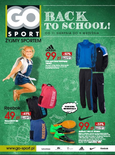 {loadposition linkGoSport} Nowa gazetka promocyjna Go Sport - "Back to school!". Polecane promocje z gazetki Go Sport: Dres sportowy dziecięcy Adidas TIBERO - 99 zł. Plecak Reebok ROY BTS - 49 zł. Halówki Nike T RIO IC JR3N15 -…