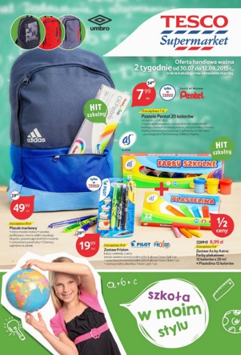 Nowy katalog Tesco - "Szkoła w moim stylu". Polecane promocje z katalogu Tesco: Plecak szkolny Adidas - 49,99 zł. Pastele Pentel 20 kolorów - 7,99 zł. Zeszyt do religii A5 32 kartki - 1,49 zł. Oferta ważna…