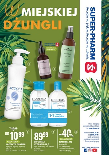 'W miejskiej dżungli' - nowa gazetka promocyjna Super-Pharm. Polecane promocje z gazetki Super-Pharm: Płyn do higieny intymnej Lactacyd Pharma 250 ml - 10,99 zł. Płyn micelarny Bioderma Hydrabio H2O 2x500 ml - 89,99 zł. Żel pod prysznic Yope…