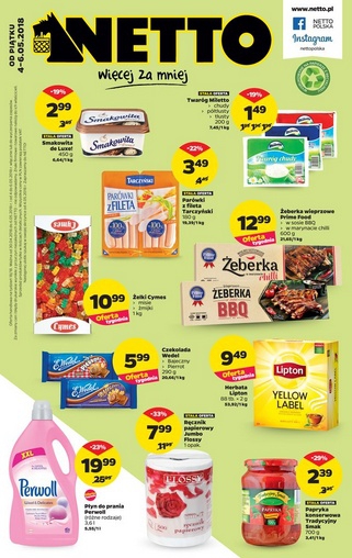 Nowa gazetka promocyjna sieci sklepów Netto. Polecane promocje z gazetki Netto: Ziemniaki wczesne 1 kg - 3,99 zł. Karkówka wieprzowa 1 kg - 14,99 zł. Płyn do prania Perwoll 3,6 L - 23,99 zł. Oferta…
