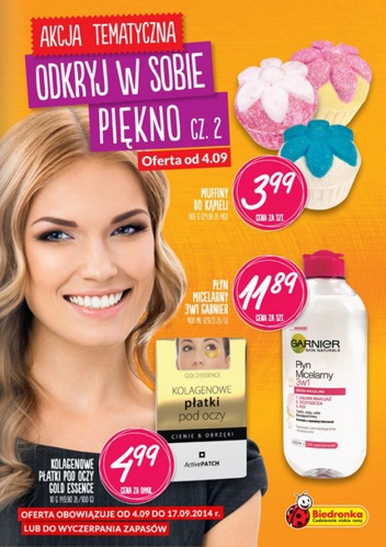 {loadposition linkBiedronka} Nowa gazetka promocyjna sieci handlowej Biedronka - "Odkryj w sobie piękno cz. 2". Polecane promocje z gazetki sieci Biedronka: Muffiny do kąpieli - 3,99 zł. Płyn micelarny 3w1 Garnier 400 ml - 11,89 zł. Kolagenowe płatki pod…