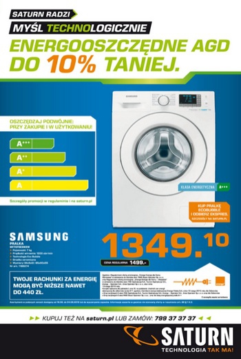 {loadposition linkMediaMarkt} Nowa gazetka promocyjna Saturn - "Energooszczędne AGD do 10% taniej". Polecane promocje z gazetki Saturn: Pralka SAMSUNG WF70F5E3W2W - 1349,10 zł Płyta indukcyjna SAMSUNG NZ64H57477K/EO - 1747,08 zł. Piekarnik do zabudowy BEKO OIM 25602 X - 1323,88…