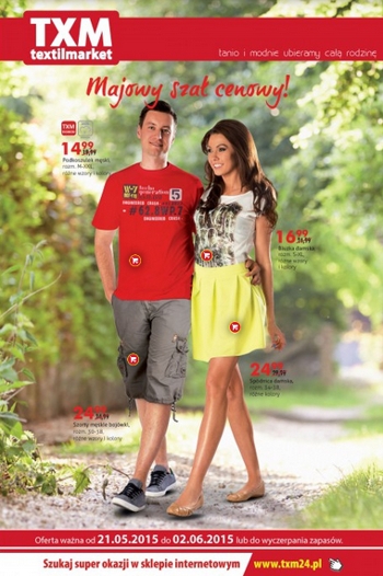 {loadposition linkTXM} Nowa gazetka promocyjna Textil Market - "Majowy szał cenowy!". Polecane promocje z gazetki Textil Market: Podkoszulek męski - 14,99 zł. Bluzka damska - 16,99 zł. Spódnica damska - 24,99 zł. Oferta ważna od 21.05 do 2.06…
