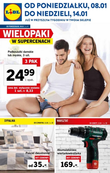 {loadposition linkLidl} Nowa gazetka promocyjna sieci sklepów Lidl - "Wielopaki w supercenach". Polecane promocje z gazetki sklepów Lidl: Podkoszulki damskie lub męskie 3-pak - 24,99 zł. Dwustronna pościel z bawełną Meradiso - od 35 zł. Akumulatorowa wiertarkowkrętarka…