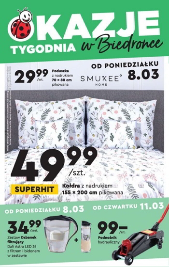 {loadposition linkBiedronka} 'Okazje tygodnia' - nowa gazetka promocyjna sieci sklepów Biedronka. Polecane promocje z gazetki sieci Biedronka: Kołdra pikowana z nadrukiem Smukee Home 155x200 cm - 49,99 zł. Poduszka pikowana z nadrukiem Smukee Home 70x80 cm - 29,99 zł.…
