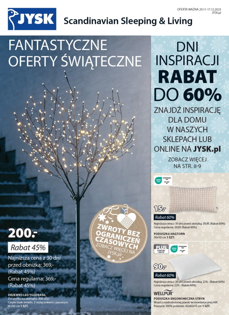 'Fantastyczne oferty świąteczne. Rabat do 60%' - nowa gazetka promocyjna sieci sklepów JYSK. Polecane promocje z gazetki Jysk: Drzewko na zewnątrz 4000 LED Yggdrasil wysokość 200 cm - 200 zł. Poduszka Hagtorn 30x50 cm - 15 zł. Poduszka ergonomiczna…