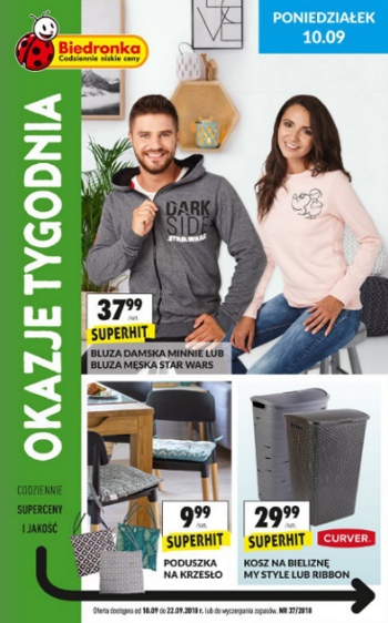 {loadposition linkBiedronka} 'Okazje tygodnia' - nowa gazetka promocyjna sieci sklepów Biedronka. Polecane promocje z gazetki sieci Biedronka: Bluza damska Minnie lub męska Star Wars - 37,99 zł. Poduszka na krzesło - 9,99 zł. Kosz na bieliznę Curver…