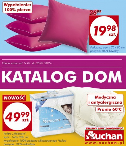 {loadposition linkAuchan} Nowa gazetka promocyjna Auchan. Polecane promocje z gazetki Auchan: Poduszka 70x80 cm - 19,98 zł. Kołdra Medicare 160x200 cm - 49,99 zł. Komplet pościeli z bawełny płaskiej - 36,99 zł. Oferta ważna od 14.01 do 25.01.