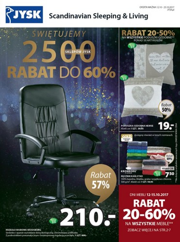 Nowa gazetka promocyjna sieci sklepów JYSK - "Świętujemy 2500 sklepów Jysk". Polecane promocje z gazetki Jysk: Rabat 20-50% na wszystkie poduszki ozdobne. Rabat 20-60% na wszystkie meble. Rabat 20-50% na wszystkie zasłony prysznicowe. Oferta…