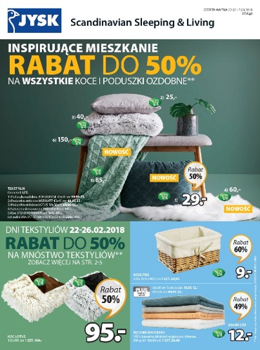 'Inspirujące mieszkanie' - nowa gazetka promocyjna sieci sklepów JYSK. Polecane promocje z gazetki Jysk: Rabat do 60% na wszystkie koce i poduszki ozdobne. Rabat do 60% na mnóstwo tekstyliów. Rabat 49% na wszystkie zasłony prysznicowe. …