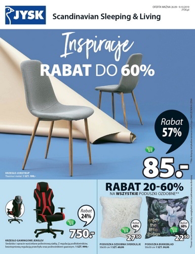 'Inspiracje' - nowa gazetka promocyjna sieci sklepów JYSK. Polecane promocje z gazetki Jysk: Rabat 20-60% na wszystkie poduszki ozdobne. Rabat do 60% na wszystkie zasłony. Rabat do 49% na wszystkie prześcieradła. Oferta ważna od…