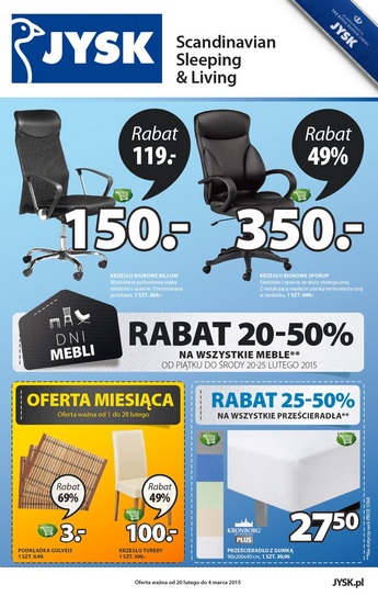 Nowa gazetka promocyjna JYSK - "Inspirujące mieszkanie". Polecane promocje z gazetki Jysk: Rabat 20-50% na wszystkie meble. Rabat 20-50% na wszystkie maty łazienkowe. Rabat 30-50% na wszystkie poduszki Wellpur. Oferta ważna od 16.02 do 1.03.