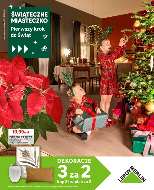 'Świąteczne miasteczko. Pierwszy krok do Świąt' - nowa gazetka promocyjna Leroy Merlin. Polecane promocje z gazetki Leroy Merlin: Poinsecja 3-pędowa 1 sztuka - 10,99 zł. Wianek zielony ∅50 cm - 39,99 zł. Kula dekoracyjna grająca LED - 79,99 zł.…