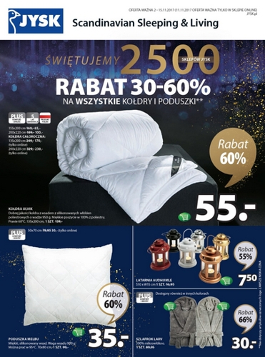 Nowa gazetka promocyjna sieci sklepów JYSK - "Świętujemy 2500 sklepów Jysk". Polecane promocje z gazetki Jysk: Rabat 30-60% na wszystkie kołdry i poduszki. Rabat 25% na zewnętrzne oświetlenie świąteczne. Rabat 25% na wszystkie pojemniki plastikowe. …