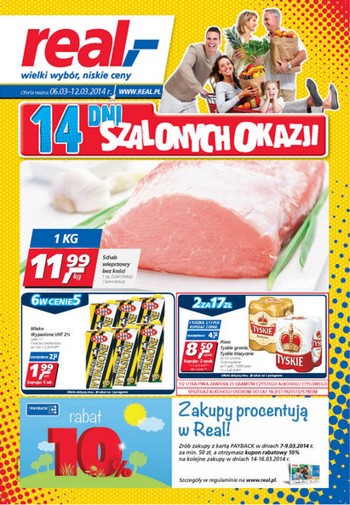 Nowa gazetka promocyjna sieci handlowej Real - "14 dni szalonych okazji". Polecane promocje z gazetki Real: Schab wieprzowy bez kości 1 kg - 11,99 zł. Piwo Tyskie 8 sztuk - 17 zł. Polędwica sopocka 1 kg - 12,49…