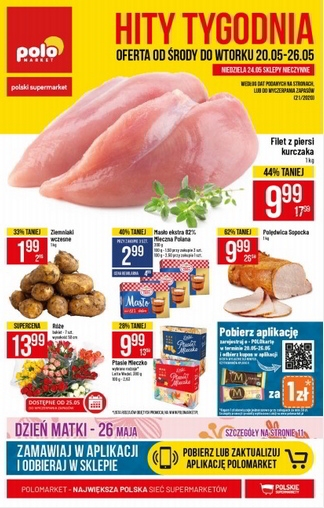 'Hity tygodnia' - nowa gazetka promocyjna sieci sklepów Polo Market. Polecane promocje z gazetki Polo Market: Filet z piersi kurczaka 1 kg - 9,99 zł. Ziemniaki wczesne 1 kg - 1,99 zł. Polędwica sopocka 1 kg…