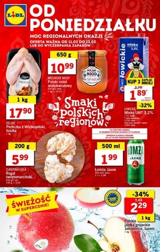 {loadposition linkLidl1} Nowa gazetka promocyjna sieci sklepów Lidl - "Od poniedziałku Tydzień Regionalny" Polecane promocje z gazetki sklepów Lidl: Polski kurczak z powolnego chowu Rzeźnik 1 kg - 8,79 zł. Polski miód wielokwiatowy Mazurskie Miody 650 g - 9,99…