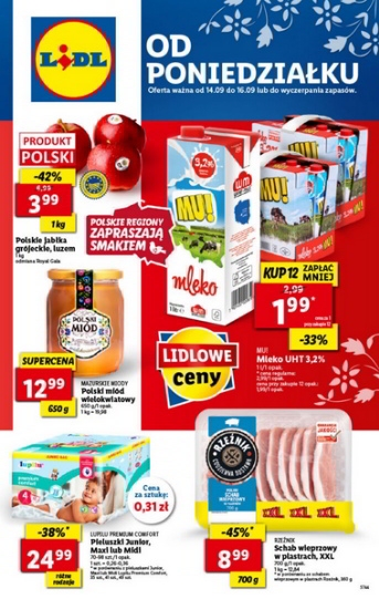 {loadposition linkLidl1} 'Od poniedziałku' - nowa gazetka promocyjna sieci sklepów Lidl. Polecane promocje z gazetki sklepów Lidl: Mleko Mu! 12x1 L - 23,88 zł. Polskie jabłka grójeckie 1 kg - 3.99 zł. Polski miód wielokwiatowy Mazurskie Miody 650 g…