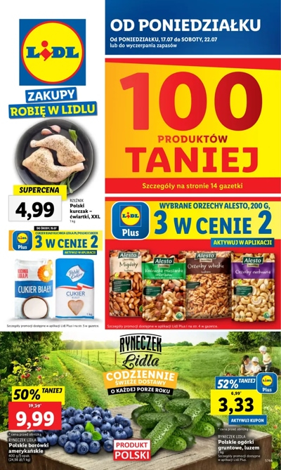 {loadposition linkLidl1} 'Od poniedziałku 100 produktów taniej' - nowa gazetka promocyjna sieci sklepów Lidl. Polecane promocje z gazetki sklepów Lidl: Polski kurczak - ćwiartki XXL Rzeźnik 1 kg - 4,99 zł. Polskie borówki amerykańskie Ryneczek Lidla 400 g -…