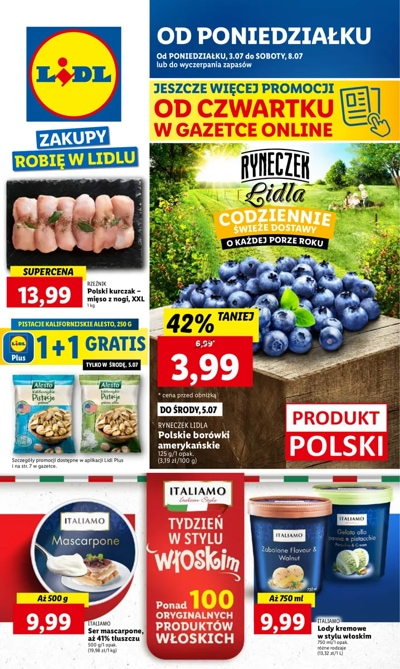 {loadposition linkLidl1} 'Od poniedziałku' - nowa gazetka promocyjna sieci sklepów Lidl. Polecane promocje z gazetki sklepów Lidl: Polskie borówki amerykańskie Ryneczek Lidla 125 g - 3,99 zł. Ser Mascarpone Italiamo 41% tłuszczu 500 g - 9,99 zł. Lody kremowe…