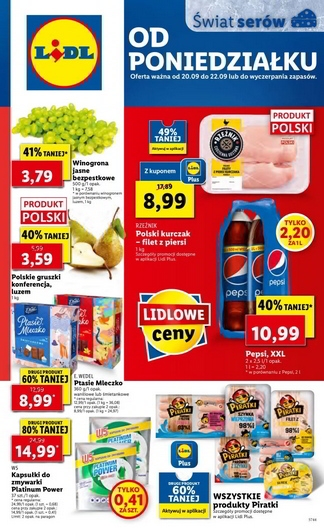 {loadposition linkLidl1} 'Od poniedzialku' - nowa gazetka promocyjna sieci sklepów Lidl. Polecane promocje z gazetki sklepów Lidl: Winogrona jasne bezpestkowe 500 g - 3,79 zł. Polskie gruszki Konferencja 1 kg - 3,59 zł. Pepsi 2x2,5 L - 10,99 zł.…