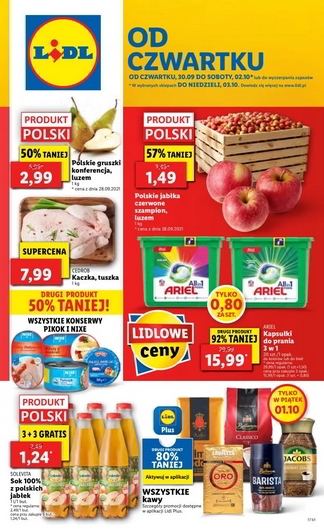 {loadposition linkLidl2} 'Od czwartku' - nowa gazetka promocyjna sieci sklepów Lidl. Polecane promocje z gazetki sklepów Lidl: Polskie jabłka czerwone Szampion 1 kg - 1,49 zł. Polskie gruszki Konferencja 1 kg - 2,99 zł. Kaczka tuszka Cedrob 1 kg…
