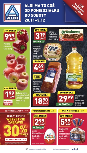 {loadposition linkAldi2} 'Aldi ma to coś od poniedziałku do soboty' - nowa gazetka promocyjna sieci sklepów Aldi. Polecane promocje z gazetki Aldi: Papryka czerwona 1 kg - 9,99 zł. Polskie jabłka 1 kg - 1,99 zł. Margaryna Smakowita maślany…