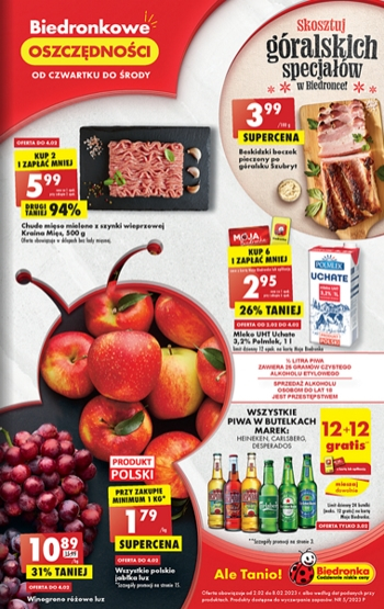 {loadposition linkBiedronka2} 'Biedronkowe oszczędności od czwartku do środy' - nowa gazetka promocyjna sieci sklepów Biedronka. Polecane promocje z gazetki sieci Biedronka: Chude mięso mielone z szynki wieprzowej Kraina Mięs 500 g - 5,99 zł*. Beskidzki boczek pieczony po góralsku…