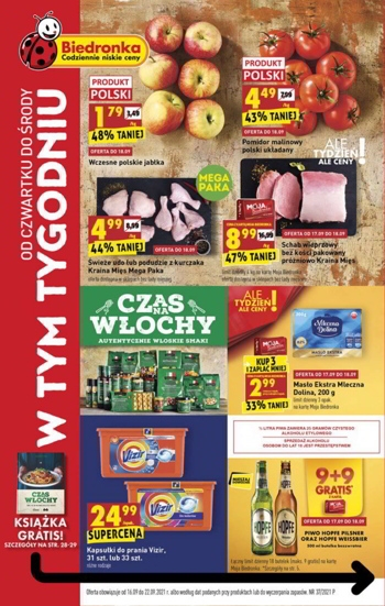 {loadposition linkBiedronka2} 'W tym tygodniu' - nowa gazetka promocyjna sieci sklepów Biedronka. Polecane promocje z gazetki sieci Biedronka: Polskie pomidory malinowe układane 1 kg - 4,49 zł. Wczesne polskie jabłka 1 kg - 1,79 zł. Schab wieprzowy bez kości…