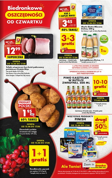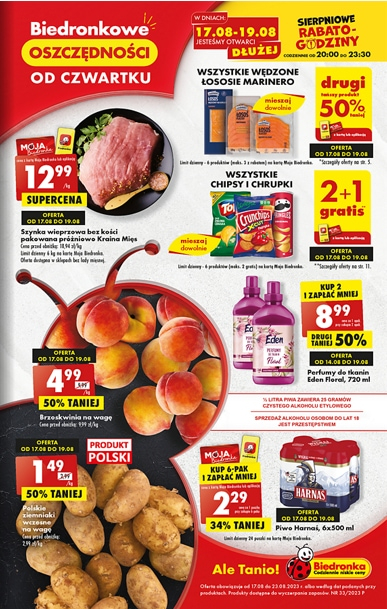 {loadposition linkBiedronka2} 'Biedronkowe oszczędności od czwartku do środy' - nowa gazetka promocyjna sieci sklepów Biedronka. Polecane promocje z gazetki sieci Biedronka: Szynka wieprzowa bez kości pakowana próżniowo Kraina Mięs 1 kg - 12,99 zł*. Brzoskwinie - 4,99 zł**. Polskie…
