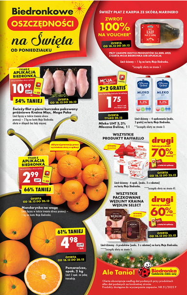 'Biedronkowe oszczędności na święta od poniedziałku' - nowa gazetka promocyjna sieci sklepów Biedronka. Polecane promocje z gazetki sieci Biedronka: Świeży filet z piersi kurczaka pakowany próżniowo Kraina Mięs 1 kg - 10,99 zł*. Mleko Mleczna Dolina 1 L -…