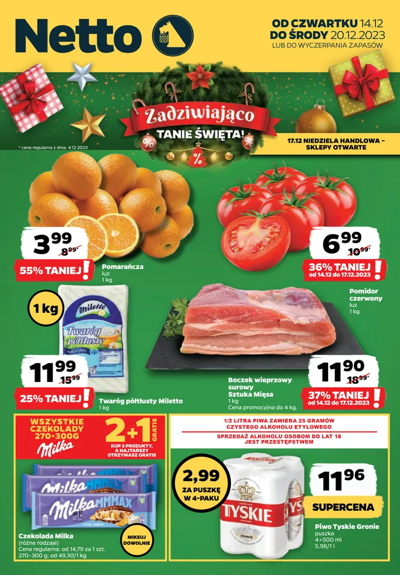 {loadposition linkNetto} 'Zadziwiająco tanie święta' - nowa gazetka promocyjna sieci sklepów Netto. Polecane promocje z gazetki Netto: Pomarańcze 1 kg - 3,99 zł. Pomidory czerwone 1 kg - 6,99 zł*. Twaróg półtłusty Miletto 1 kg - 11,99 zł. …