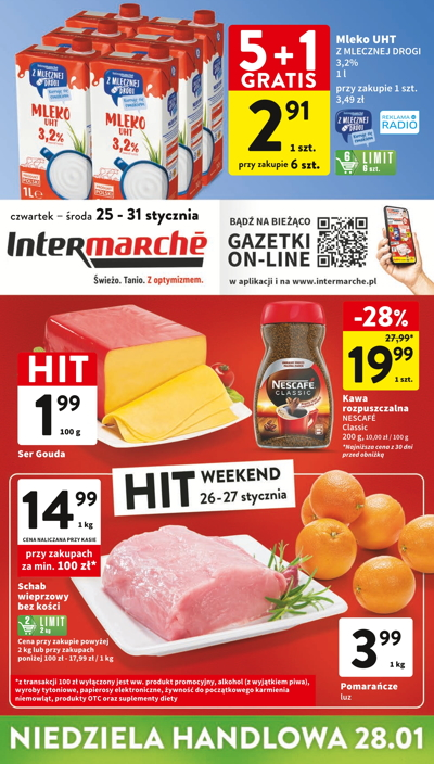 Nowa gazetka promocyjna sieci sklepów Intermarche Polecane promocje z gazetki Intermarche: Mleko UHT Z Mlecznej Drogi 1 L - 2,91 zł*. Ser Gouda 100 g - 1,99 zł. Pomarańcze 1 kg - 3,99 zł. * - cena za…