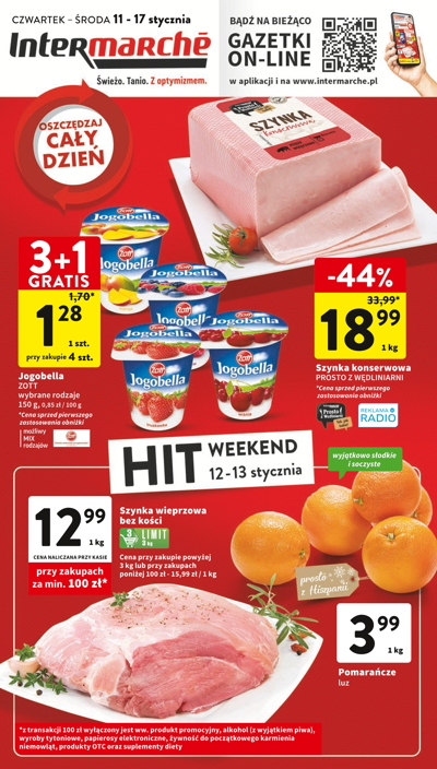 'Oszczędzaj cały dzień' - nowa gazetka promocyjna sieci sklepów Intermarche Polecane promocje z gazetki Intermarche: Jogurt Jogobella Zott 150 g - 1,28 zł*. Szynka konserwowa Prosto Z Wędliniarni - 18,99 zł. Pomarańcze 1 kg - 3,99 zł**. *…