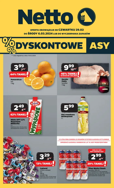 {loadposition linkNetto3} 'Dyskontowe asy' - nowa gazetka promocyjna sieci sklepów Netto. Polecane promocje z gazetki Netto: Pomarańcze 1 kg - 3,99 zł. Kaczka Pekin 1 kg - 9,99 zł*. Mleko Wypasione Mlekovita 1 L - 2,49 zł. *…