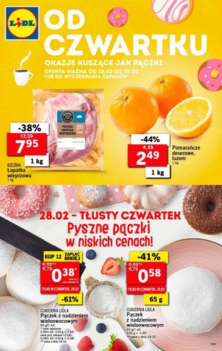 {loadposition linkLidl2} 'Od czwartku okazje kuszące jak pączki' - nowa gazetka promocyjna sieci sklepów Lidl. Polecane promocje z gazetki sklepów Lidl: Łopatka wieprzowa Rzeźnik 1 kg - 7,95 zł. Pomarańcze deserowe 1 kg - 2,49 zł. Pączek…