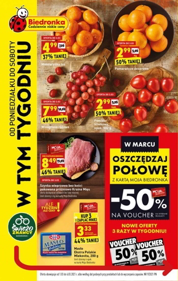 {loadposition linkBiedronka1} 'W tym tygodniu' - nowa gazetka promocyjna sieci sklepów Biedronka. Polecane promocje z gazetki sieci Biedronka: Mandarynki 1 kg - 4,99 zł. Pomarańcze deserowe 1 kg - 2,99 zł. Winogrono różowe 1 kg - 7,99 zł. …