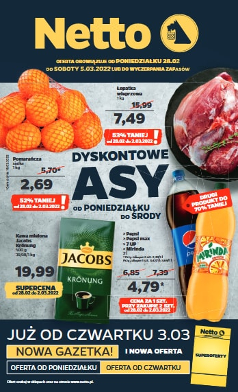 {loadposition linkNetto} 'Dyskontowe asy tygodnia' - nowa gazetka promocyjna sieci sklepów Netto. Polecane promocje z gazetki Netto: Pomarańcze siatka 1 kg - 2,69 zł. Łopatka wieprzowa 1 kg - 7,49 zł. Kawa mielona Jacobs Kronung 500 g - 19,99…