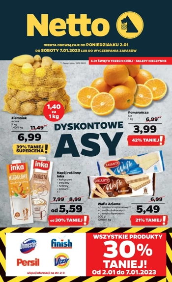 {loadposition linkNetto} 'Dyskontowe asy' - nowa gazetka promocyjna sieci sklepów Netto. Polecane promocje z gazetki Netto: Ziemniaki 5 kg - 6,99 zł. Pomarańcza 1 kg - 3,99 zł. Napój roślinny Inka 1 L - 5,59 zł. Oferta…
