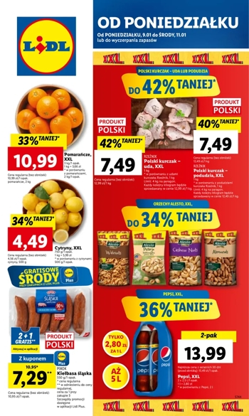{loadposition linkLidl1} 'Od poniedziałku XXL' - nowa gazetka promocyjna sieci sklepów Lidl. Polecane promocje z gazetki sklepów Lidl: Polski kurczak - uda lub podudzia Rzeźnik XXL 1 kg - 7,49 zł*. Pepsi 2x2,5 L - 13,99 zł. Pomarańcze 3…