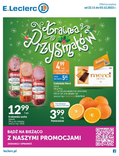 {loadposition linkEleclerc3} 'Kraina przysmaków' - nowa gazetka promocyjna sieci handlowej E.Leclerc. Polecane promocje z gazetki E.Leclerc: Kiełbasa Krakowska sucha Olewnik 255 g - 12,99 zł. Czekolada Merci 100 g - 4,99 zł*. Pomarańcze 1 kg - 3,99 zł**. …
